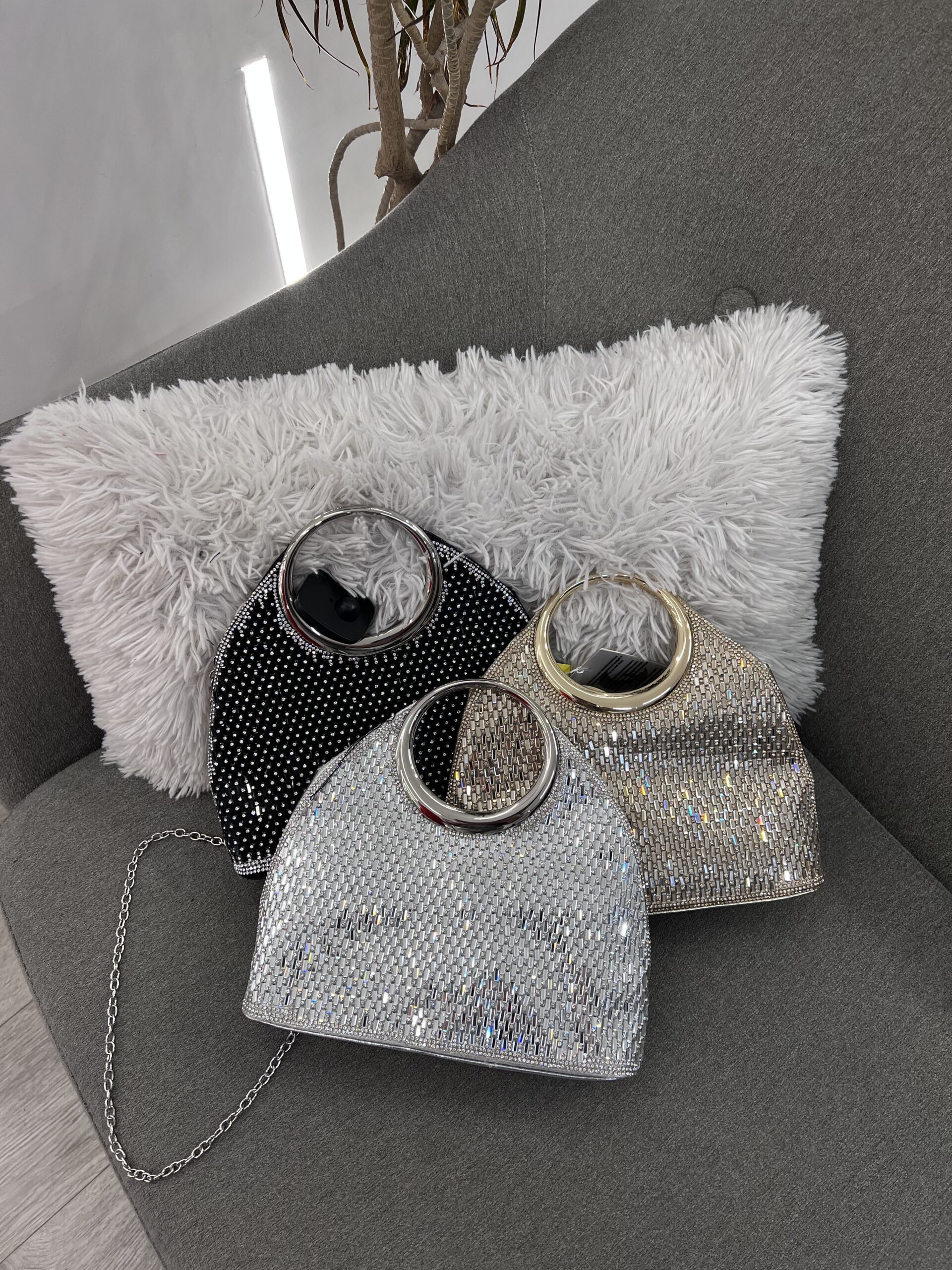 ✨ Trio Klaç me Shkëlqim Diamanti dhe Dorezë Rrethore