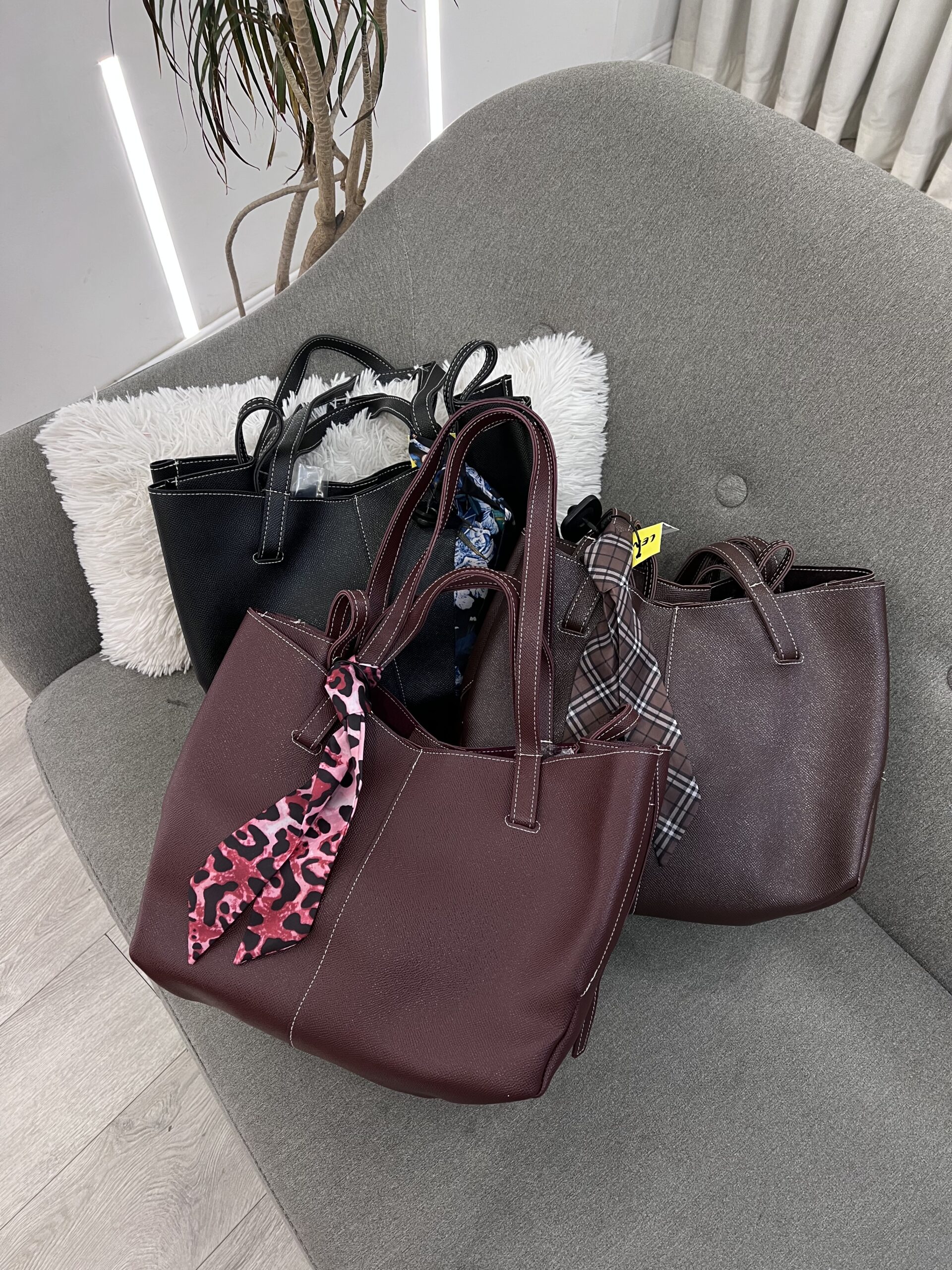 Ky set prezanton tri çanta ‘tote’ (shopping bag) me një dizajn të thjeshtë, por elegant, të cilat janë praktike për përditshmëri dhe punë.Ky set prezanton tri çanta ‘tote’ (shopping bag) me një dizajn të thjeshtë, por elegant, të cilat janë praktike për përditshmëri dhe punë.