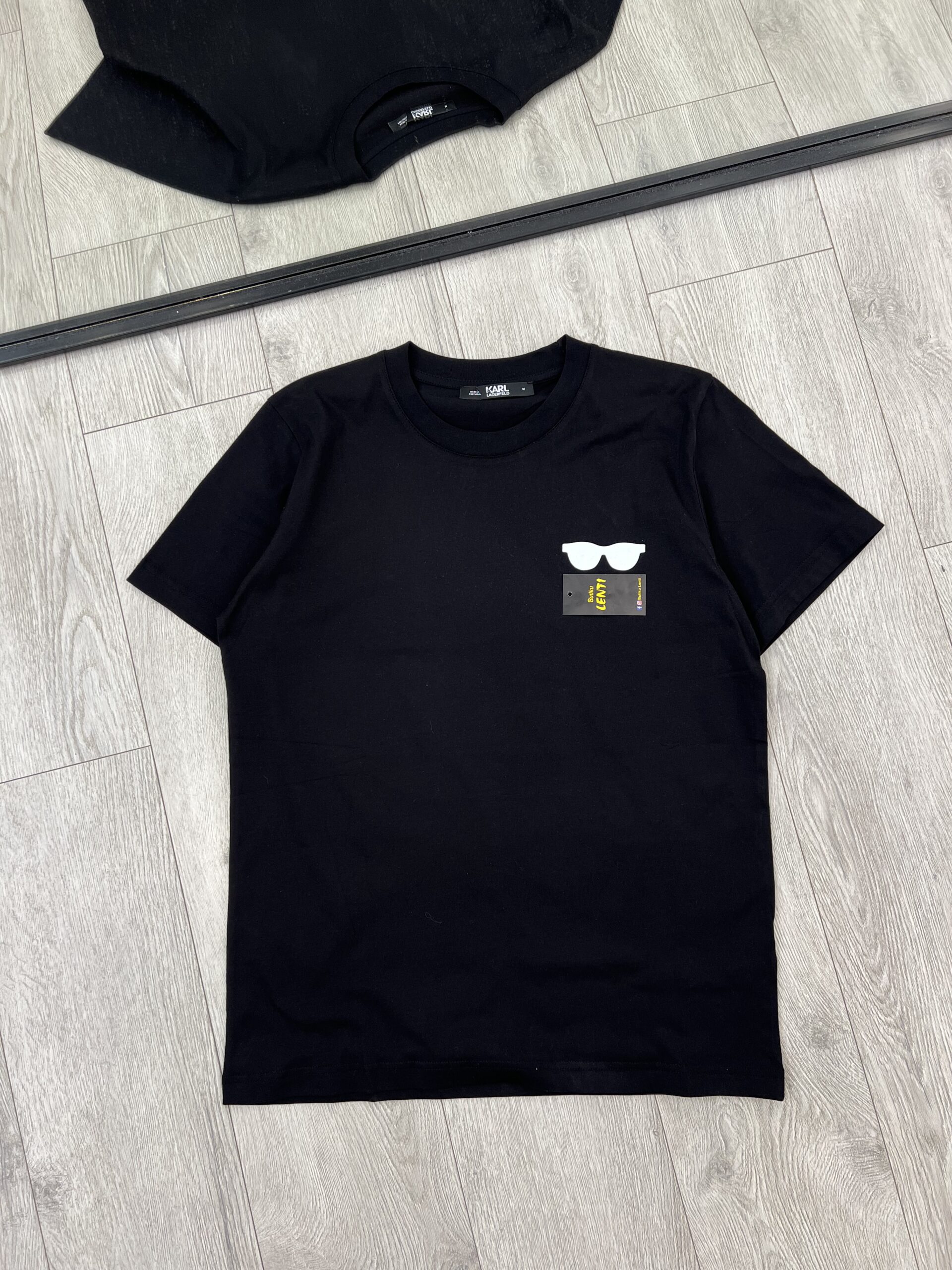 Një bluzë e zezë me mëngë të shkurtra është e palosur me kujdes dhe e vendosur mbi një dysheme me pamje druri. Në pjesën e sipërme të djathtë të bluzës, ndodhet një grafikë e thjeshtë syzesh dielli të bardha. Direkt poshtë kësaj grafike, varet një etiketë e zezë me tekst të verdhë, ku shkruhet “LENTI”. Bluza duket e re dhe e pastër, ndërsa një bluzë tjetër e errët, ndoshta e njëjtë, shihet e pasqyruar në një sipërfaqe poshtë.