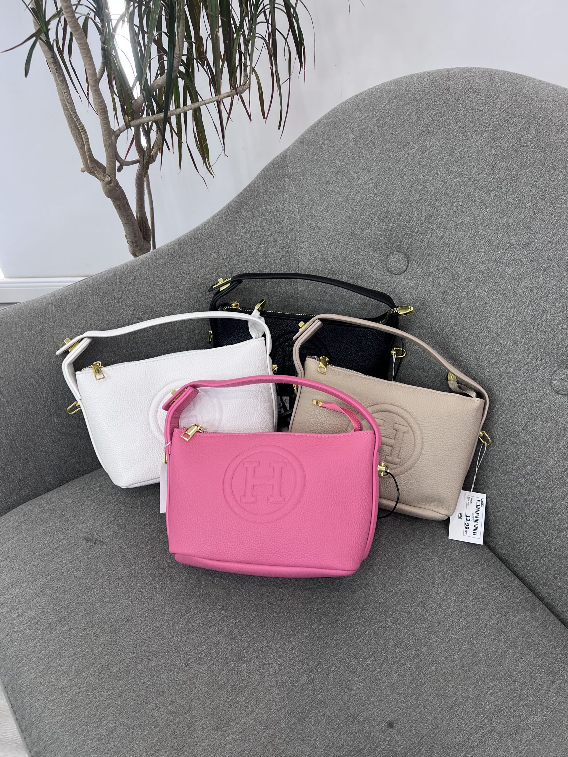 Në këtë fotografi shfaqen katër canta, një rozë, një e bardhë, një krem dhe një e zezë, të cilat janë vendosur mbi një kolltuk me teksturë gri. Të gjitha çantat kanë një logo në formë të rrethit me një “H” në mes të stampuar në pjesën e përparme, e cila i jep një pamje unike. Canta rozë është vendosur në plan të parë, duke qenë në qendër të vëmendjes. Pas saj, janë vendosur tre çantat e tjera. Të gjitha çantat kanë një dorezë të shkurtër dhe një zinxhir. Këto canta duken ideale për një dalje në qytet apo një mbrëmje me shoqërinë, duke shtuar një notë elegance dhe stili në veshjen tuaj. Ato janë një zgjedhje e shkëlqyer për ata që preferojnë dizajnin e thjeshtë, por me detaje që bëjnë diferencën.