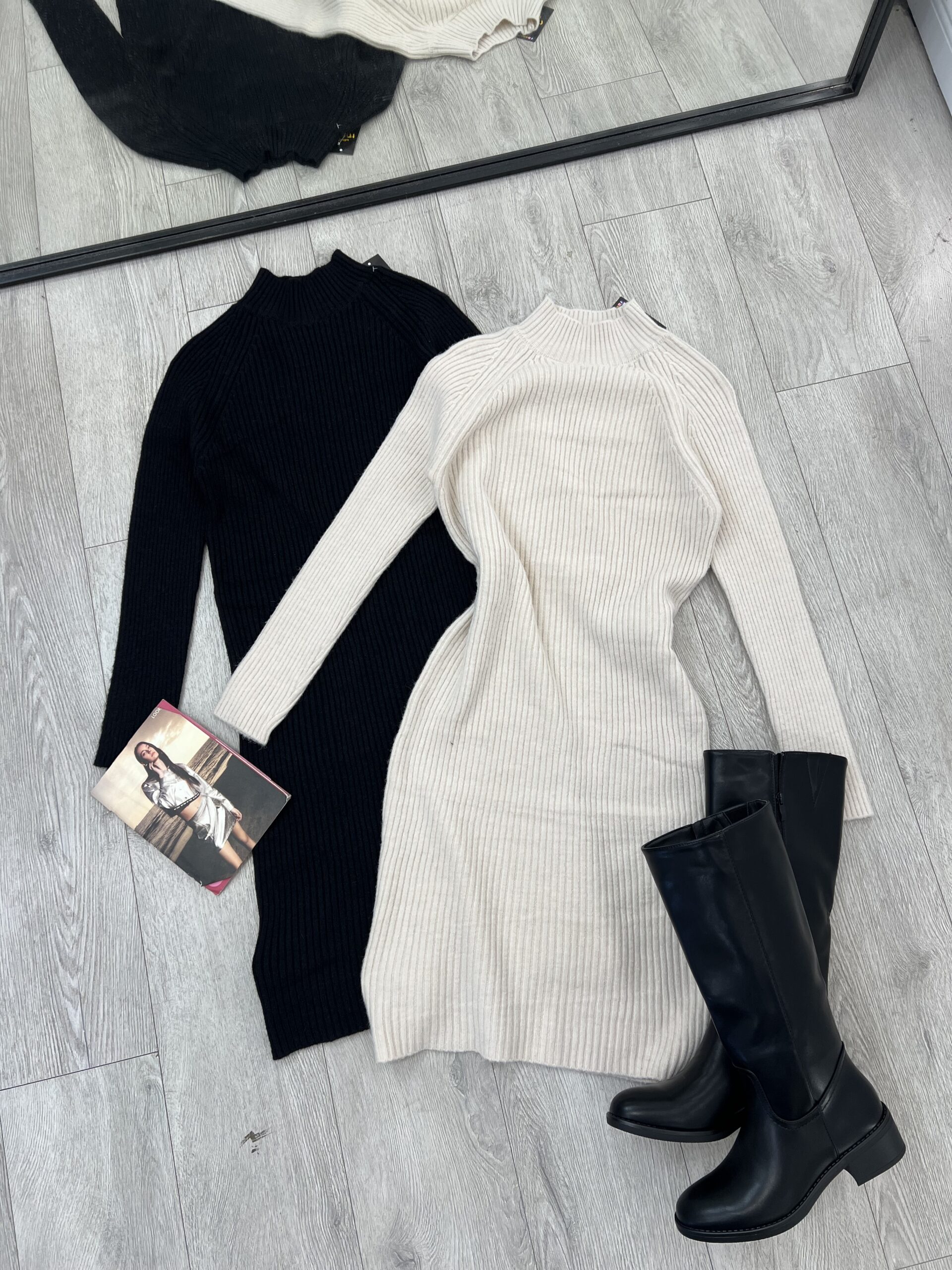 Këta fustane të thurur janë një zgjedhje e përkryer për stinën e ftohtë, duke ofruar stil dhe rehati. Të punuar me një material trikotimi me vija vertikale, ata theksojnë formën e trupit në mënyrë elegante.