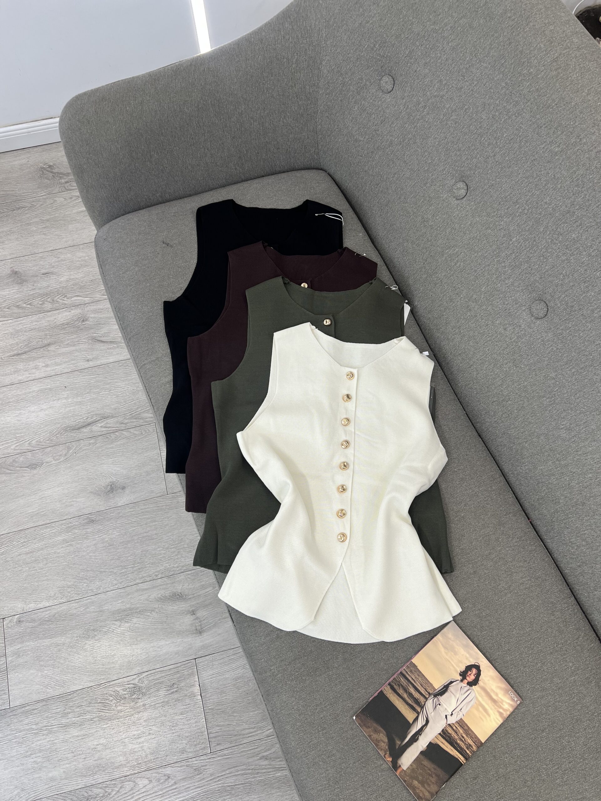 Ky koleksion përmban katër jelekë të shkurtër me kopsa, perfektë për të krijuar një veshje unike dhe të rafinuar. Të disponueshëm në ngjyrat e bardhë, jeshile e errët, kafe dhe i zi, këta jelekë kanë një prerje elegantë. Kopsat e shkëlqyeshme e bëjnë këtë veshje me stil. Këta jelekë mund të kombinohen lehtësisht me këmisha ose bluza për një pamje të veçantë dhe moderne.