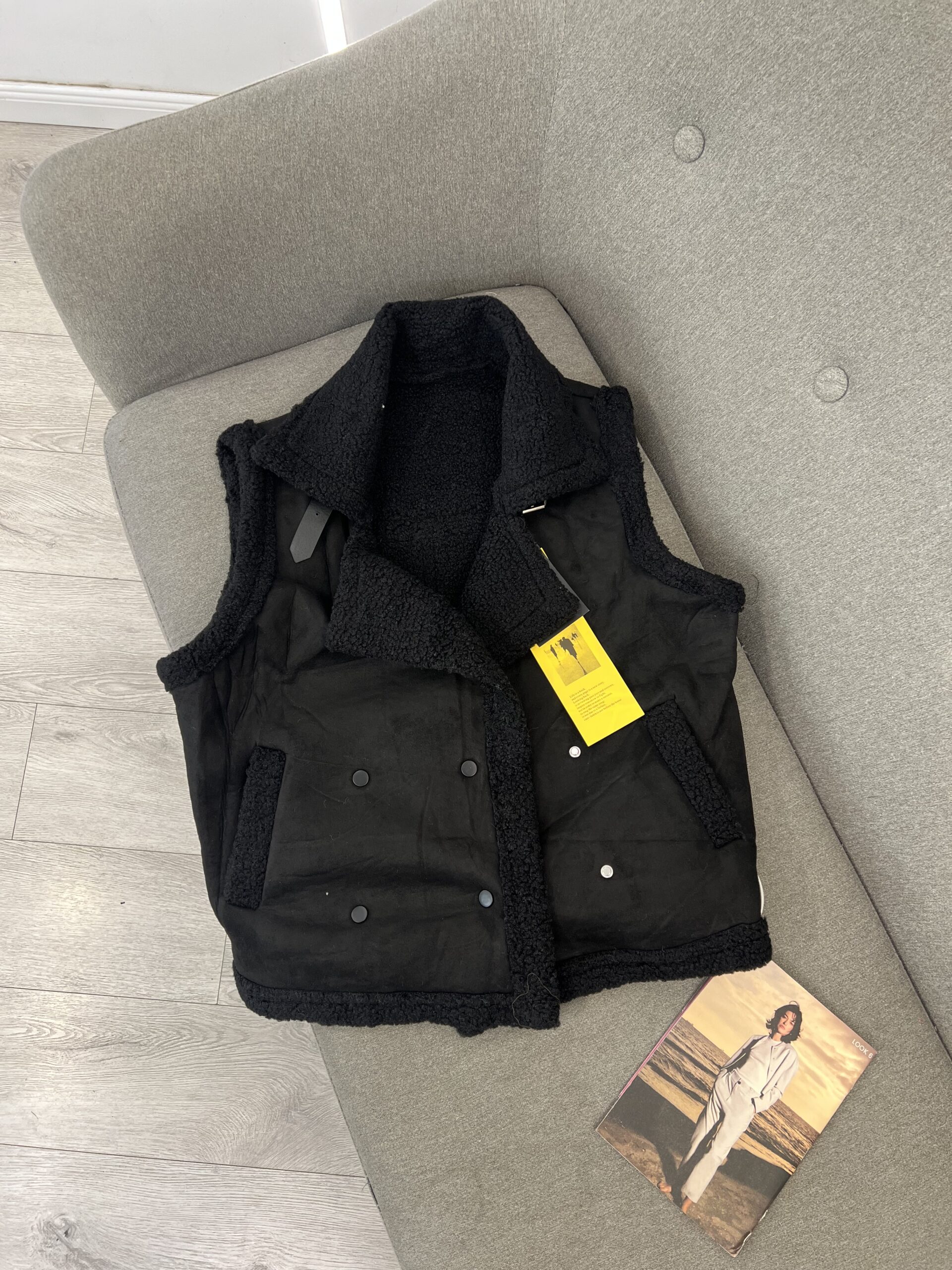 Kjo jelekë me stil motoçiklisti ka një kombinim të materialit të zi me pamje kamoshi në pjesën e jashtme dhe pelush të zi (teddy fleece) në pjesën e brendshme, duke krijuar një kontrast të bukur. Ajo mbyllet me kopsa dhe ka xhepa në pjesën e përparme. Kjo jelekë është një zgjedhje e guximshme dhe stilistike.