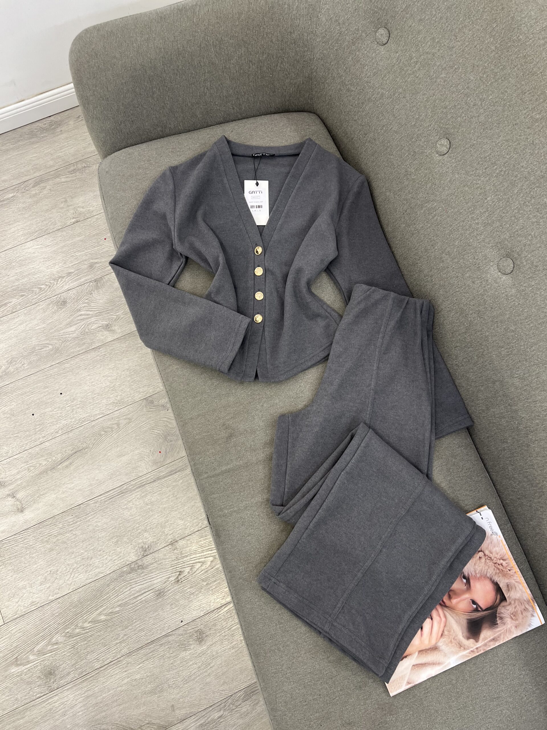 Komplet elegant dy-pjesësh në ngjyrë gri i përbërë nga bluzë/cardigan me kopsa dekorative ngjyrë ari dhe pantallona me prerje të drejtë. Material i butë dhe i ngrohtë, shumë komod për veshje të përditshme apo dalje casual-elegante. Dizajn modern që thekson bukur linjat dhe kombinohet lehtë me këpucë klasike apo sportive.