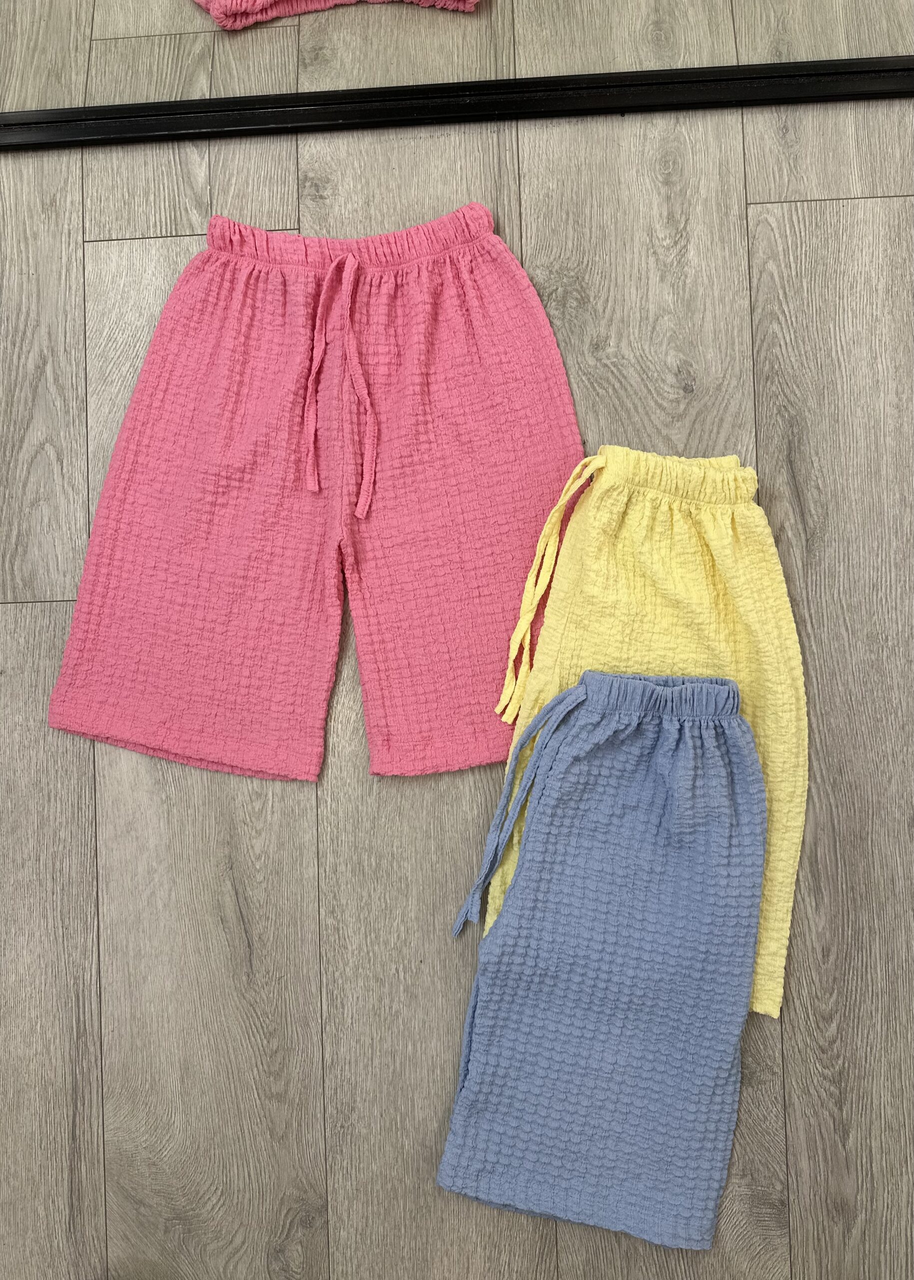 Ky imazh shfaq tre palë pantallona të shkurtra për fëmijë, të vendosura mbi një dysheme me pamje druri. Ato vijnë në ngjyra të bukura dhe të zbehta: rozë, e verdhë dhe blu. Të gjitha palët e pantallonave kanë një dizajn të thjeshtë dhe praktik, me brez elastik dhe kordon rregullues në pjesën e përparme, duke i bërë ato të rehatshme dhe të përshtatshme për t’u veshur. Materiali duket i lehtë dhe me një teksturë të valëzuar, ideal për t’i mbajtur fëmijët freskët gjatë ditëve të ngrohta të verës. Këto pantallona janë një zgjedhje e shkëlqyer për lojëra në natyrë dhe aktivitete verore.