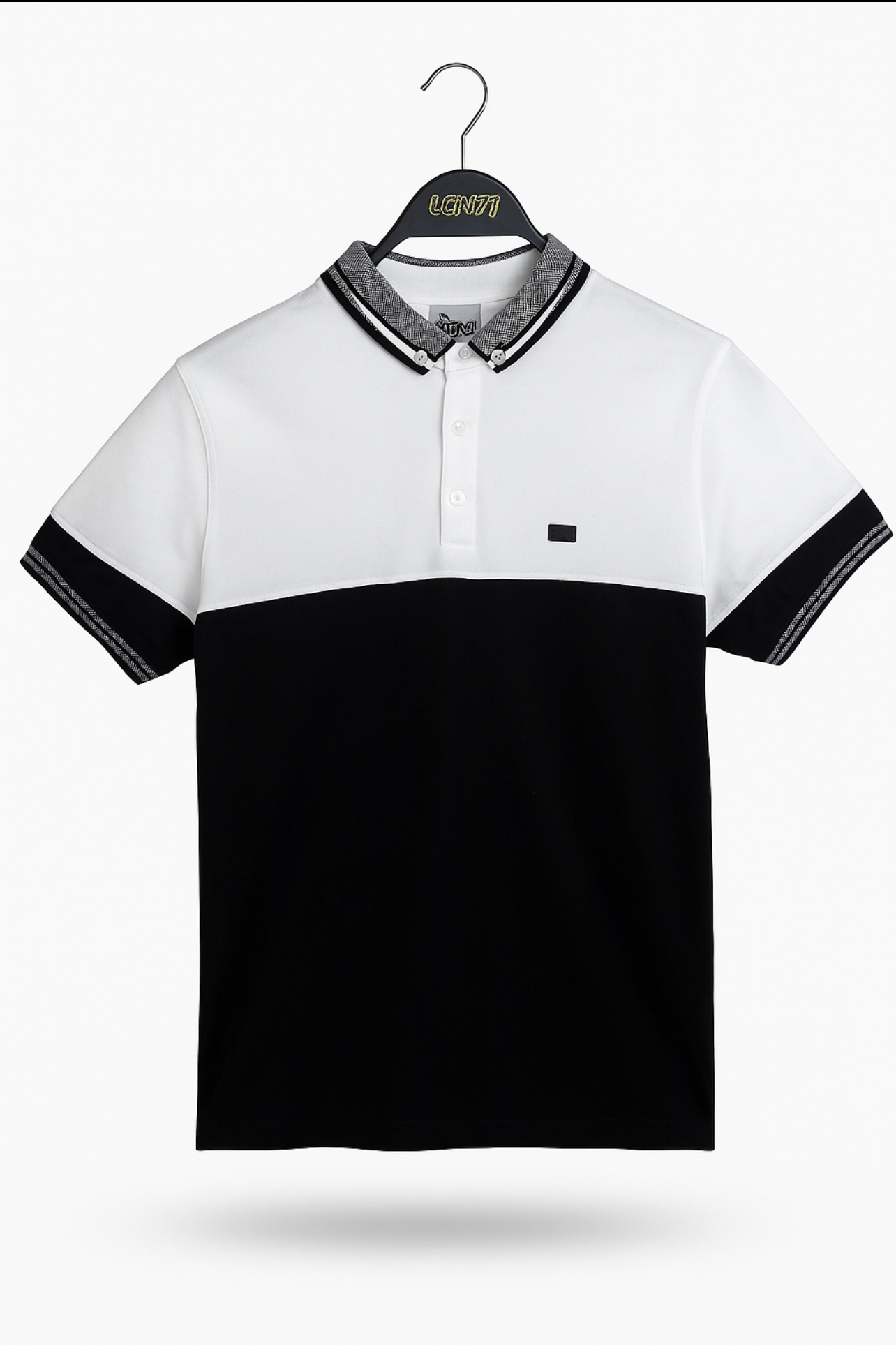 Kjo bluzë elegante me jakë, e njohur si “polo”, ofron një kontrast tërheqës me pjesën e sipërme të bardhë dhe pjesën e poshtme në një nuancë të thellë të zezë. Materiali i saj i butë dhe i frymëshëm siguron komfort maksimal gjatë gjithë ditës. Detajet e menduara përfshijnë jakën dhe bordurën e mëngëve në ngjyrë të zezë me një teksturë delikate me vija gri, si dhe një stemë të vogël dhe diskrete në anën e majtë të gjoksit. Me kopsa të bardha për një pamje të pastër, kjo polo është zgjedhja perfekte për një stil të rastësishëm por të rafinuar, ideal për aktivitete të përditshme apo për pamje më të kujdesshme. Është një shtesë e shkëlqyer për çdo garderobë, duke ofruar shkathtësi dhe elegancë klasike.