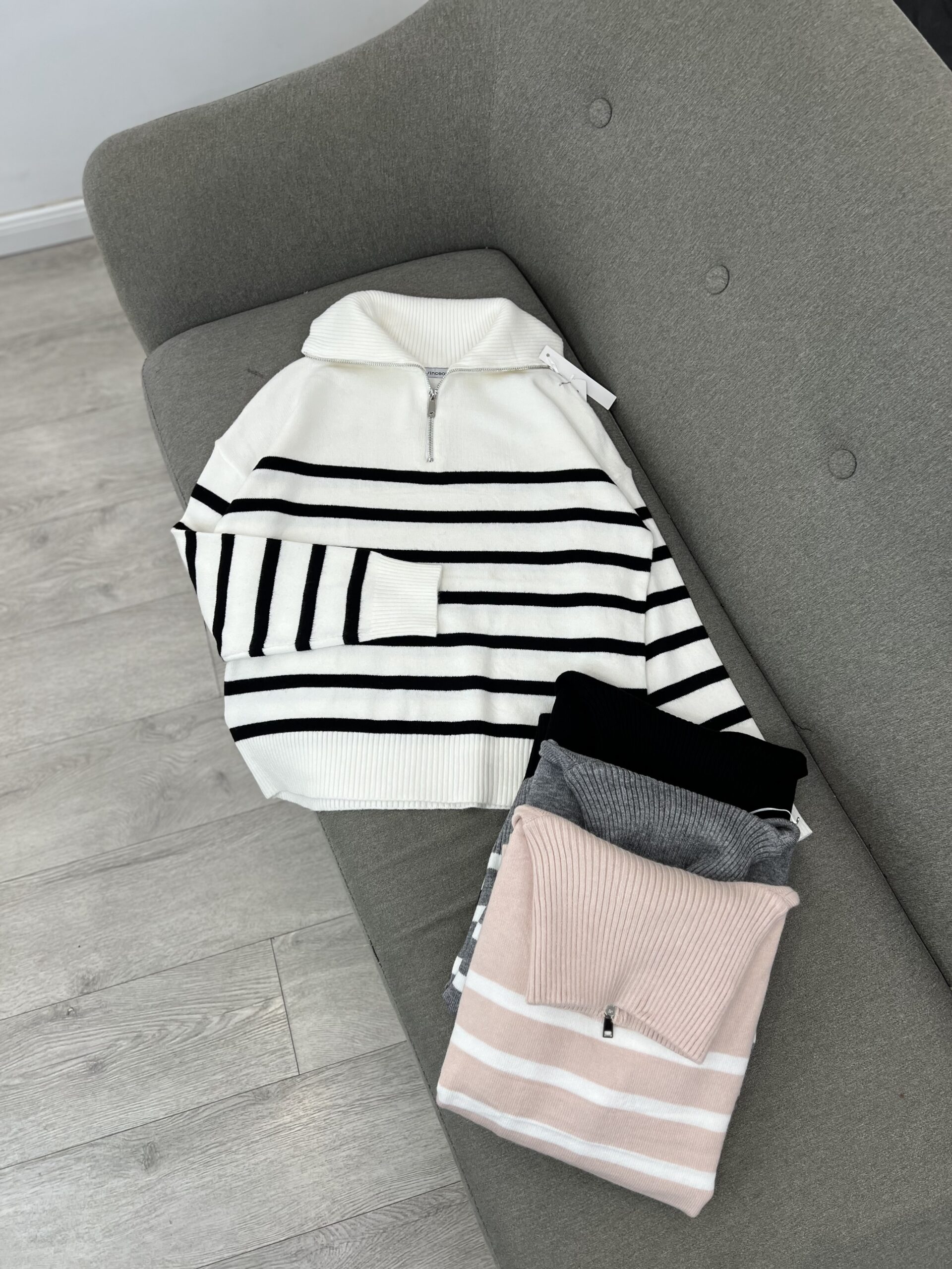 Këta puloverë janë zgjedhja perfekte për ditët e ftohta, duke ofruar ngrohtësi dhe stil. Të punuar me një material të butë, me vija horizontale, ata kanë një jakë të lartë me zinxhir në pjesën e sipërme, duke lejuar që të rregulloni stilin sipas dëshirës.