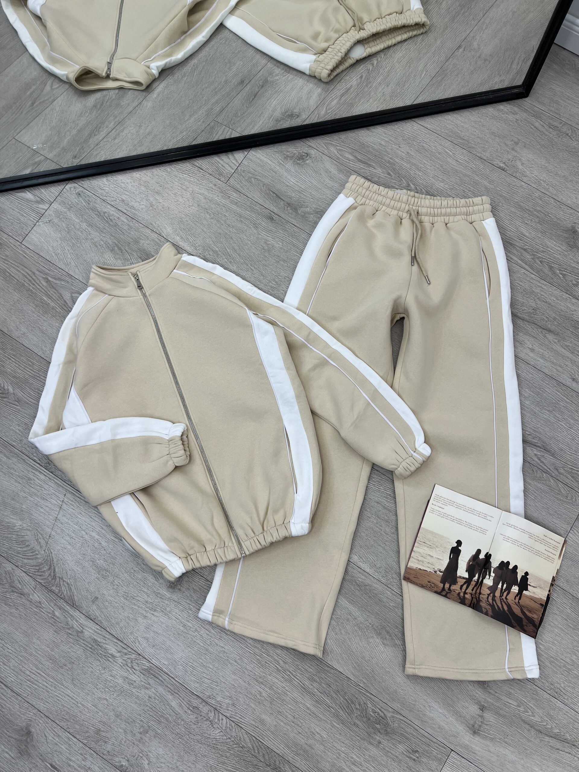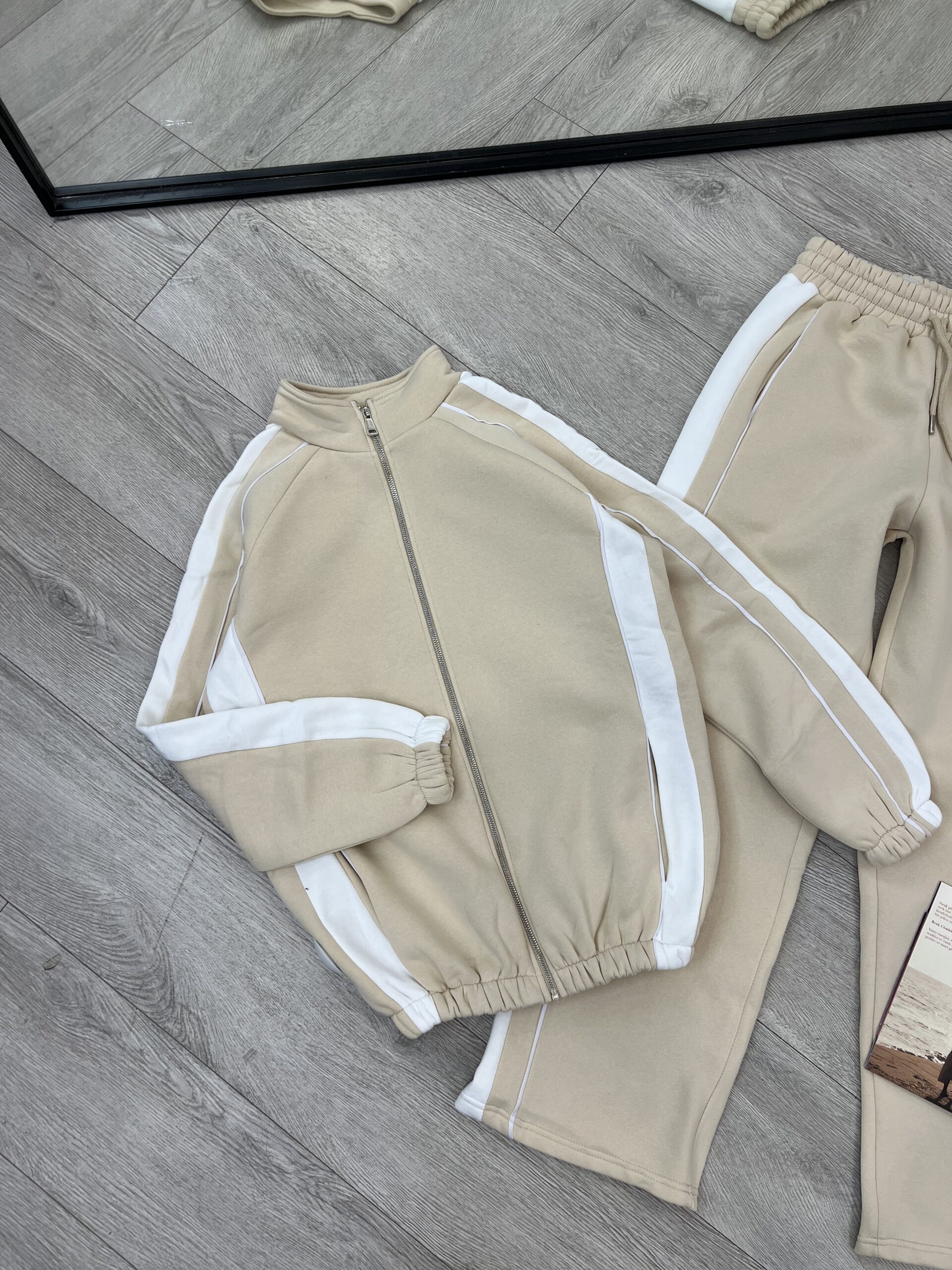 Ky set tutash është një zgjedhje perfekte për rehati dhe stil. I përbërë nga një xhaketë me zinxhir dhe pantallona, ai ka një ngjyrë bazë bezhë që i jep një pamje të butë dhe të qetë. Vija të theksuara të bardha shtrihen nga qafa deri në kyçet e krahëve, duke i dhënë një prekje sportive. Pantallonat me bel të lartë kanë të njëjtat vija të bardha në anët, duke krijuar një linjë të pastër dhe harmonike. Xhaketa ka një prerje pak të shkurtër me elastik në fund, duke e bërë setin ideal për një veshje të relaksuar dhe moderne.