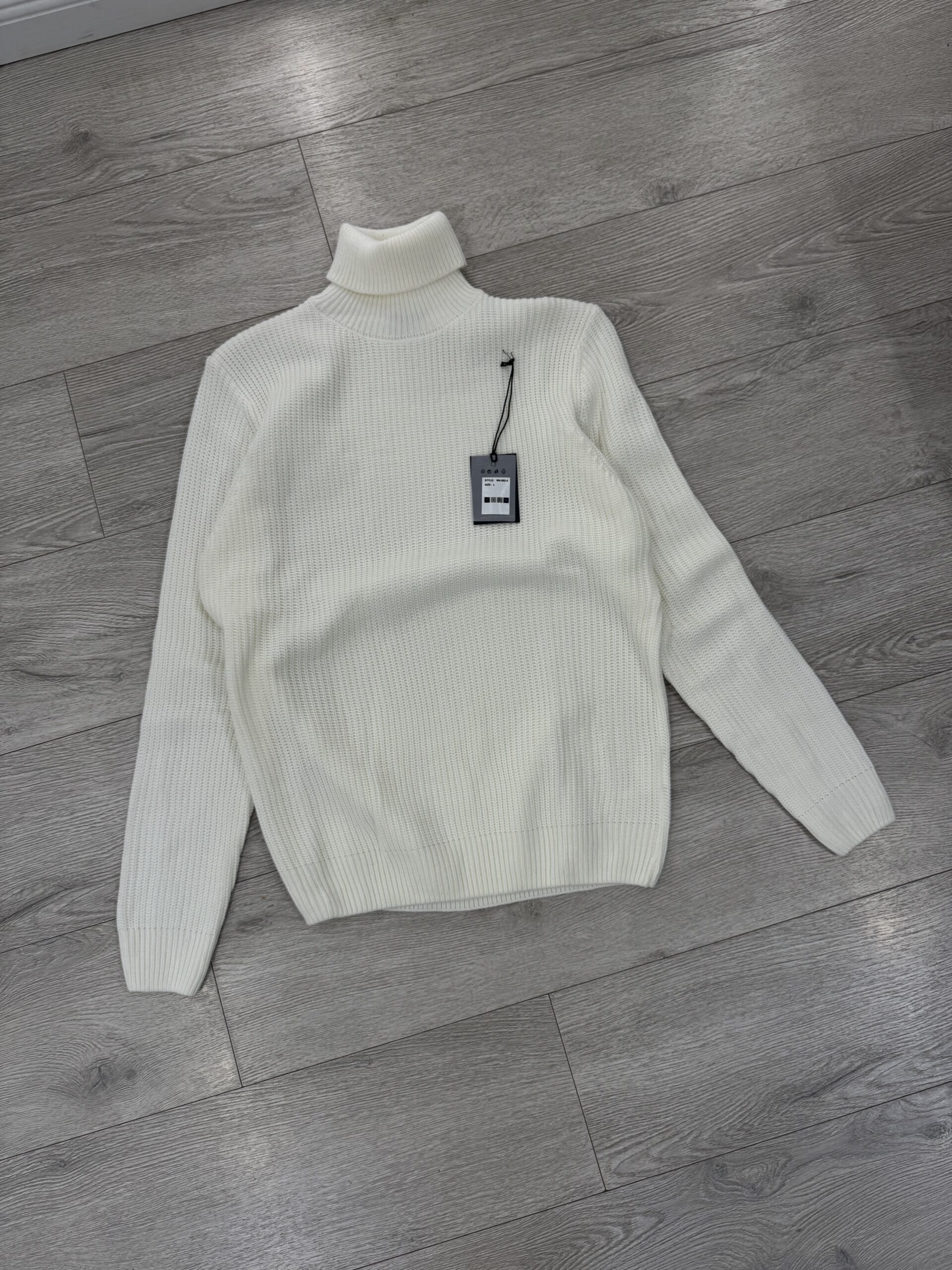 Shitet triko pambuku me thurje të dukshme (ribbed knit) dhe grykë të lartë, ngjyrë e bardhë (off-white). Një veshje elegante dhe shumë e ngrohtë, e cila i shton dritë dhe stil garderobës tuaj gjatë sezonit të dimrit.