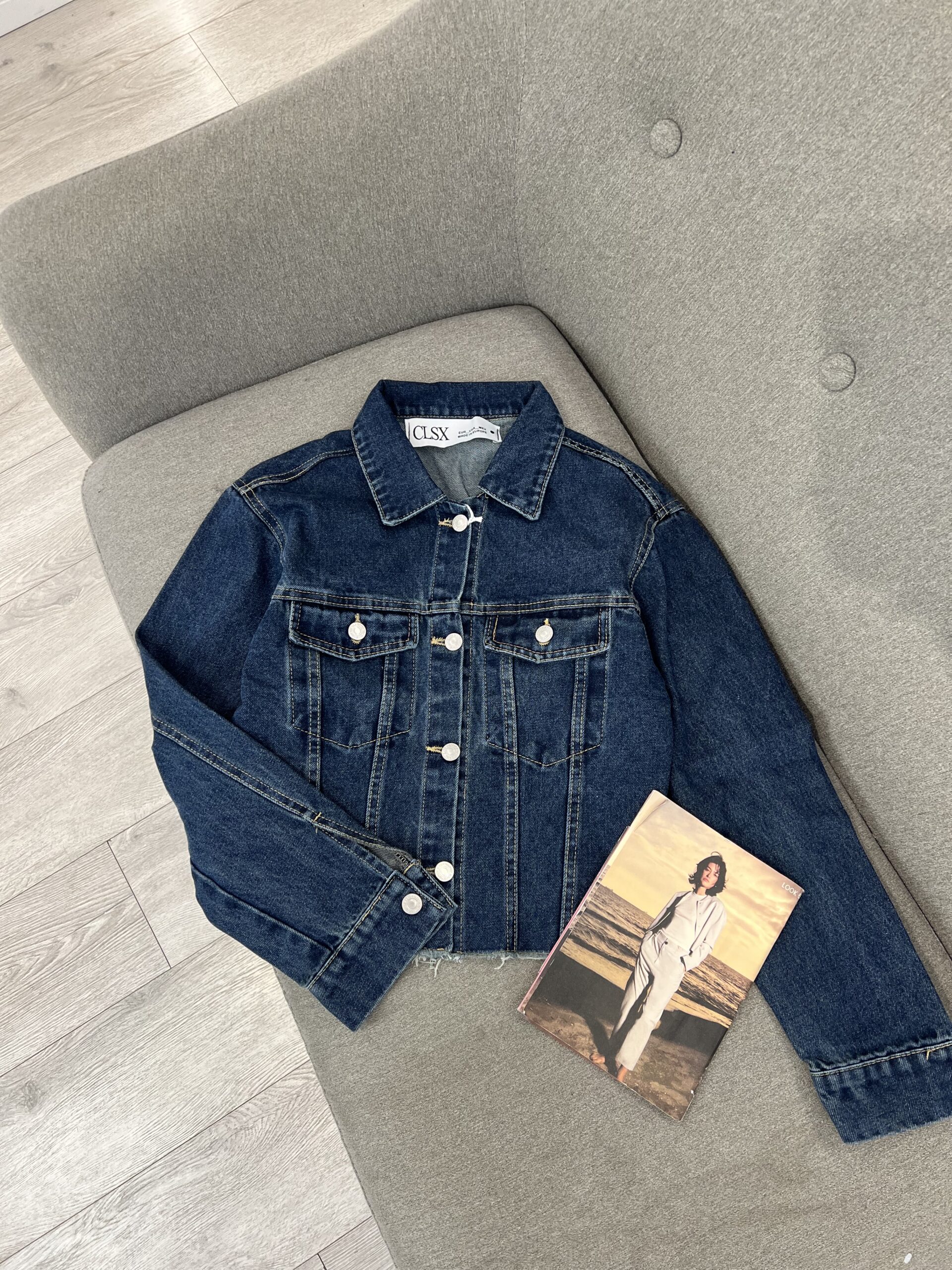 Kjo është një xhaketë xhinxhi me ngjyrë blu të errët, me një prerje të shkurtër (crop top) që e bën shumë moderne dhe të përshtatshme për t’u kombinuar me pantallona apo funde me bel të lartë. Ka një dizajn klasik me jakë, dy xhepa në pjesën e sipërme të kraharorit me mbyllje me buton, dhe butona të bardhë që krijojnë një kontrast të bukur me ngjyrën e xhinxhit. Mëngët kanë mbyllje me buton.