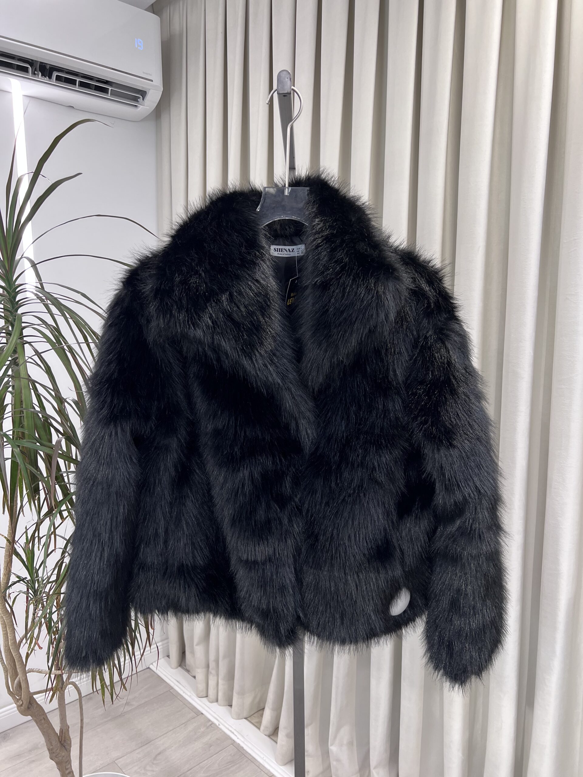 Ky xhup i shkurtër me lesh sintetik është zgjedhja ideale për të shtuar një pamje luksoze dhe të ngrohtë në veshjet tuaja. Ngjyra klasike dhe elegante e zezë e bën atë të kombinuar lehtësisht me çdo lloj veshjeje.
