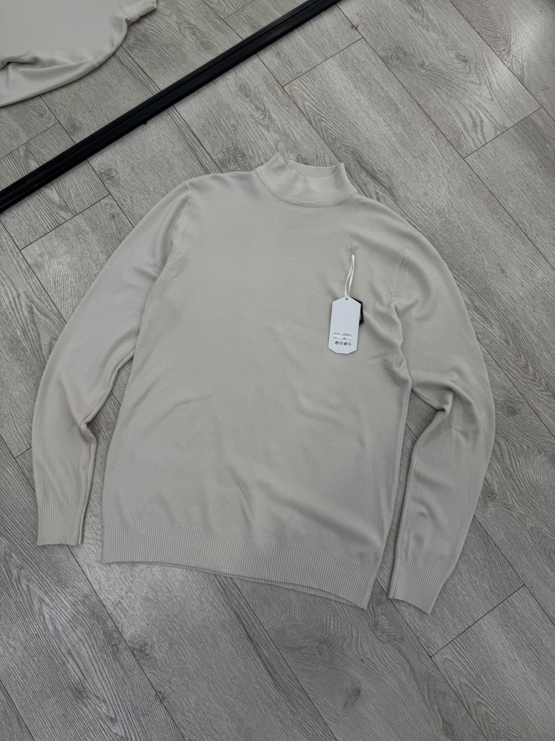 Shitet bluzë me grykë gjysmë të lartë në ngjyrë kremi (beige), me një dizjan minimalist dhe modern. Një veshje mjaft e gjithanshme që ofron një pamje të kuruar dhe është e përshtatshme për t’u veshur poshtë palltove ose xhaketave.