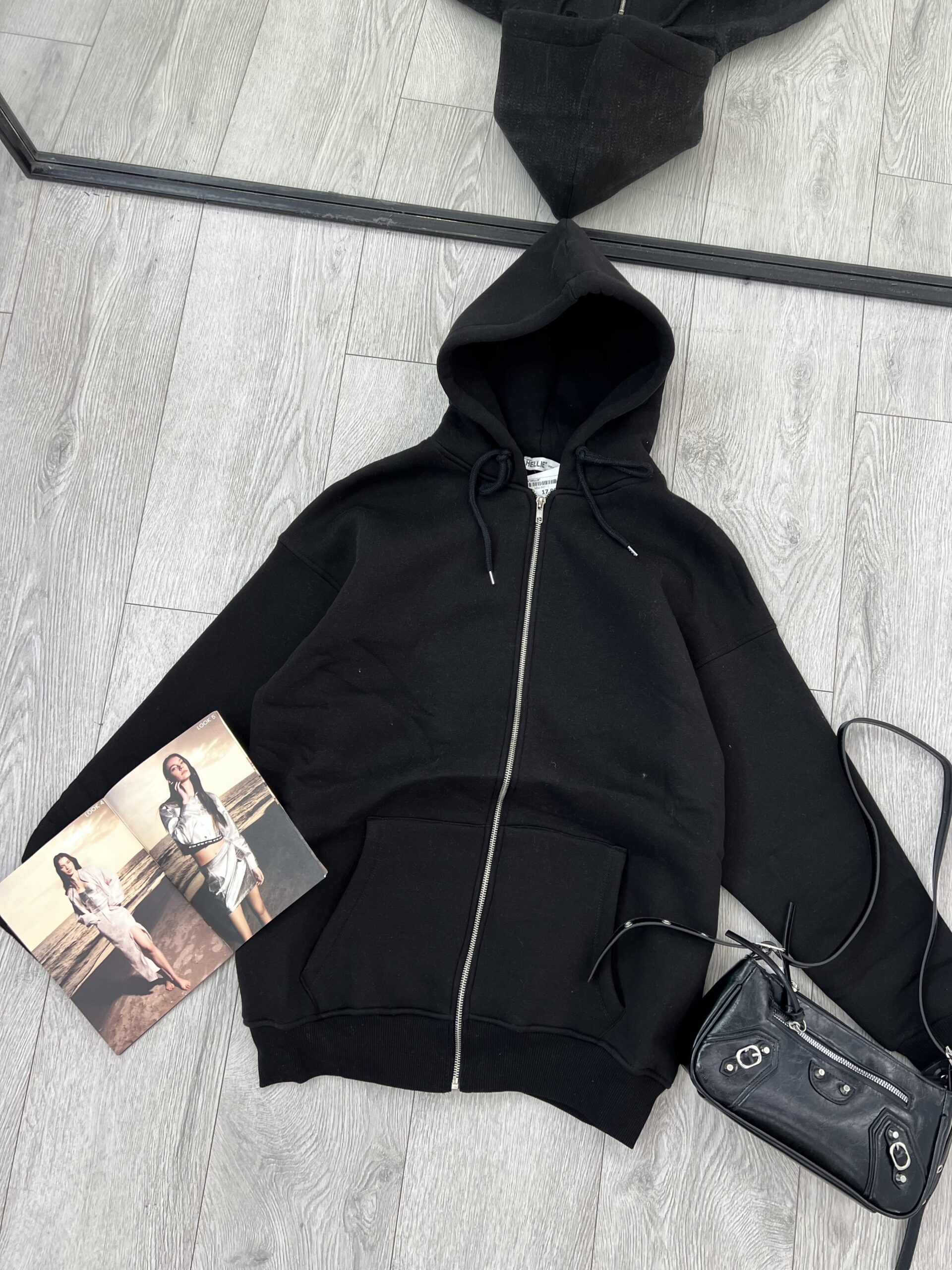“Një xhaketë sportive me kapuç, me prerje të gjerë ( oversized) në ngjyrë të zezë. Kjo hoodie ka zinxhir në pjesën e përparme, dy xhepa anësorë dhe lidhëse për të rregulluar kapuçin. Ideale për një pamje të rehatshme dhe moderne, e cila është e përshtatshme për veshje të përditshme.”