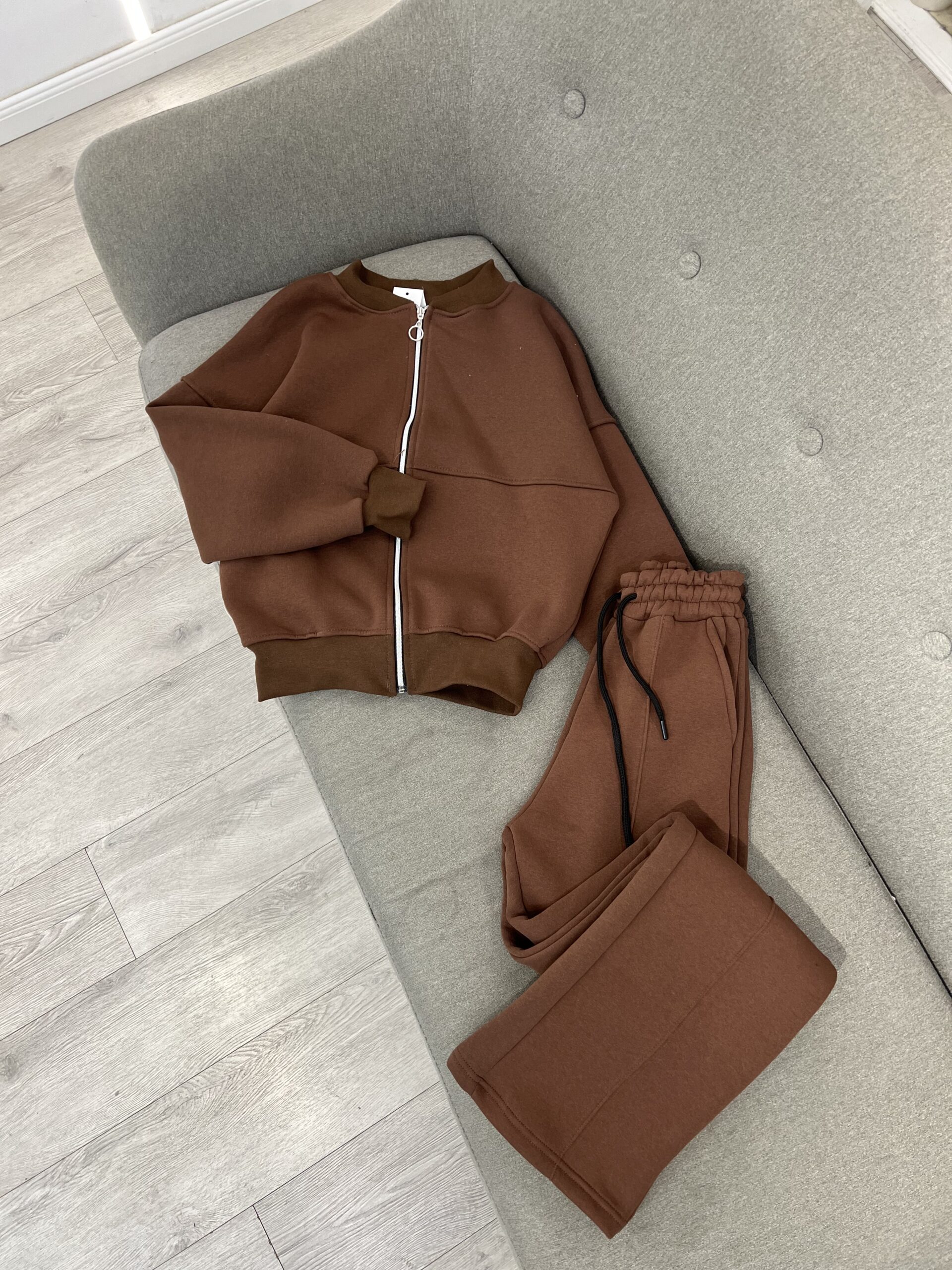 Ky set veshjesh përbëhet nga një xhaketë bomber me zinxhir dhe një palë pantallona, të dyja në një ngjyrë të ngrohtë dhe trendi kafe çokollate. Tuta ka një stil modern dhe shumë të rehatshëm oversize (i gjerë). • Xhaketa: Ka një prerje të gjerë (oversized), me mëngë të gjata dhe jakë të shkurtër tip bomber. Mbyllet me një zinxhir të bardhë që krijon një kontrast të këndshëm me ngjyrën kafe. Pjesa e belit dhe manshetat në fund të mëngëve janë me llastik të valëzuar, duke shtuar detajet e stilit bomber. • Pantallonat: Janë me bel me llastik dhe kordon (i zi) për rregullim (stil jogger), gjithashtu me prerje të lirshme. Vërehen detaje si qepje vertikale.