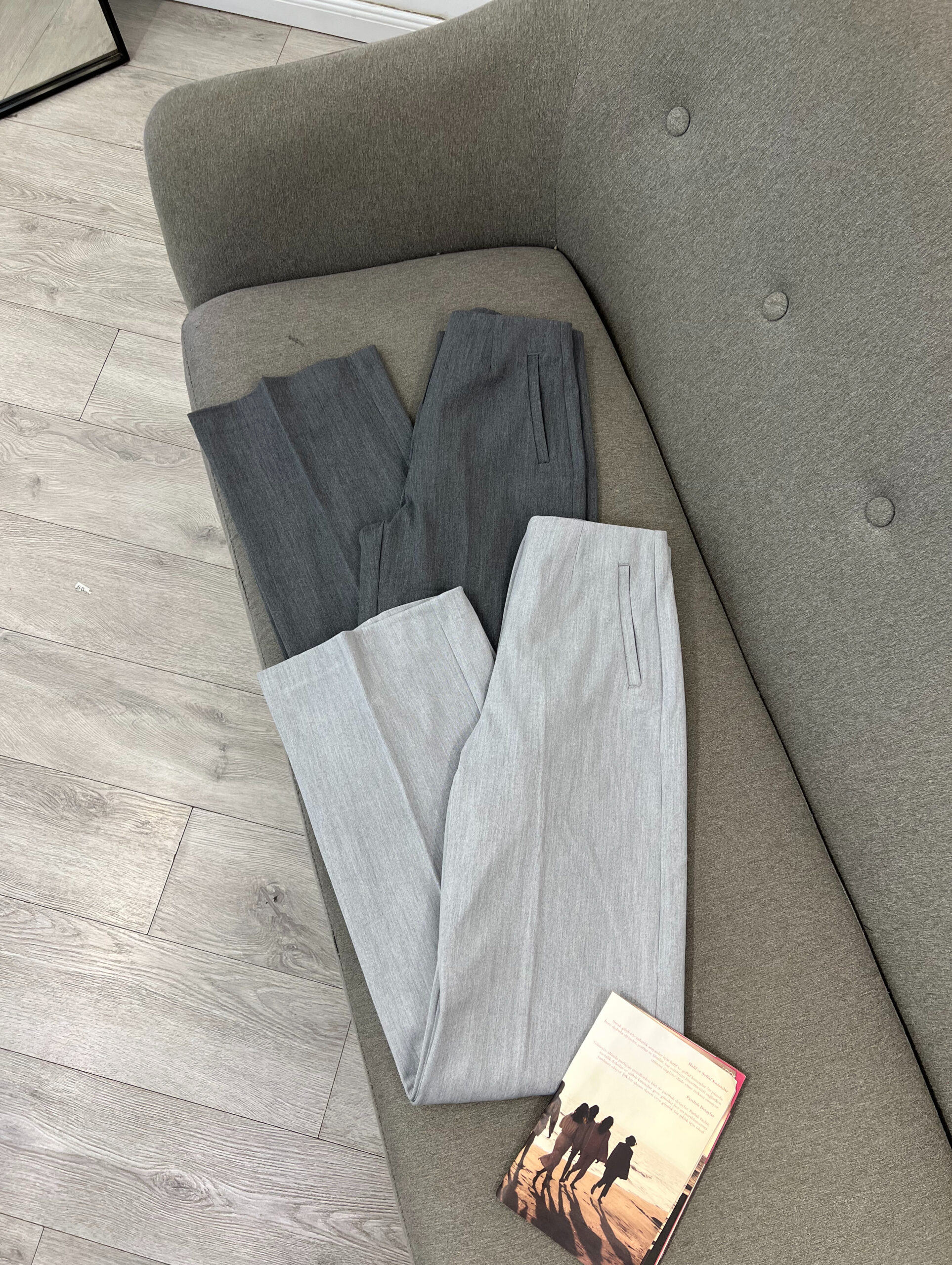 Pantallonat në plan të parë janë në një ngjyrë të lehtë gri, me një model të thjeshtë dhe të pastër. Ato kanë një prerje të drejtë dhe të gjerë.