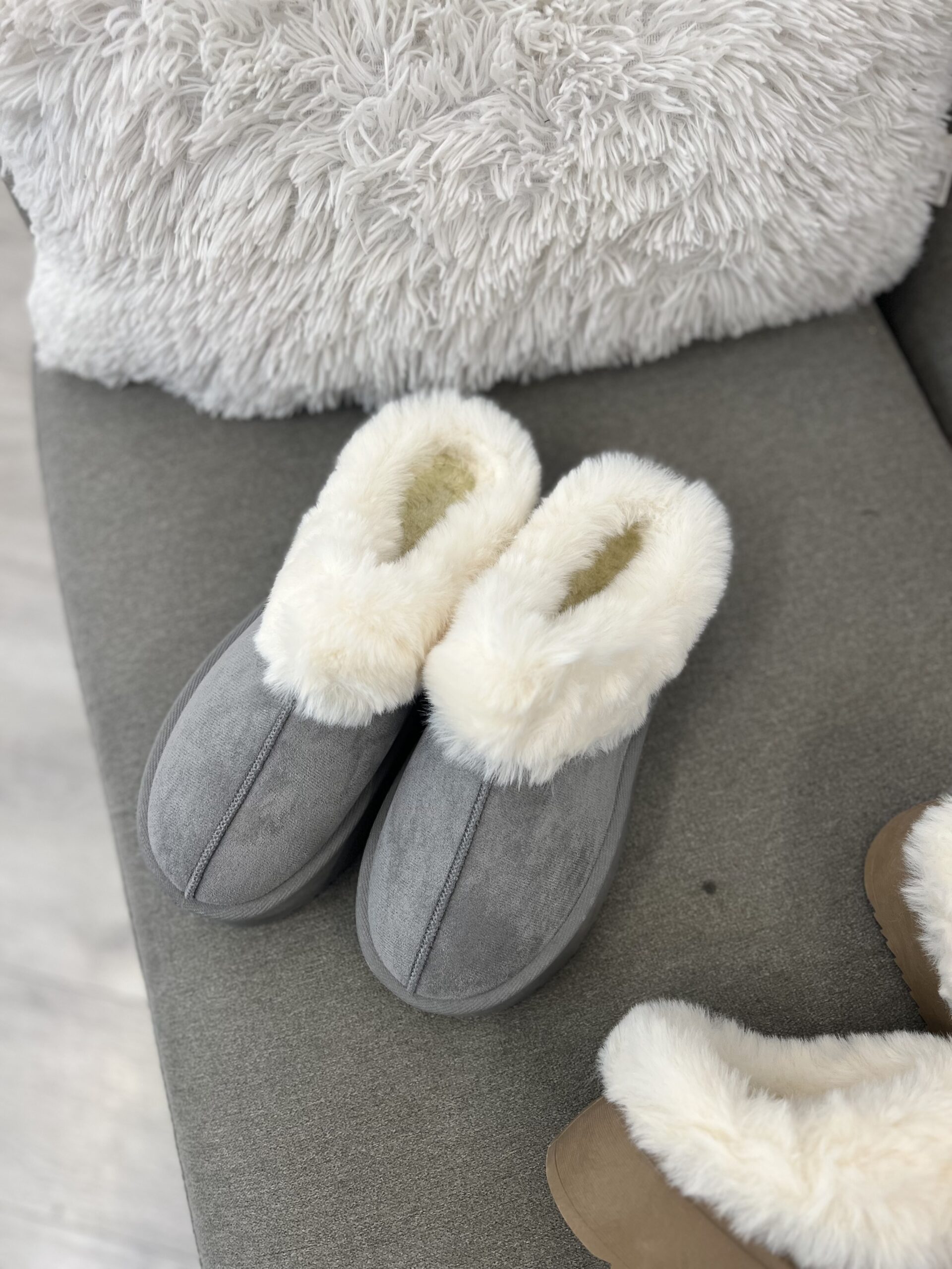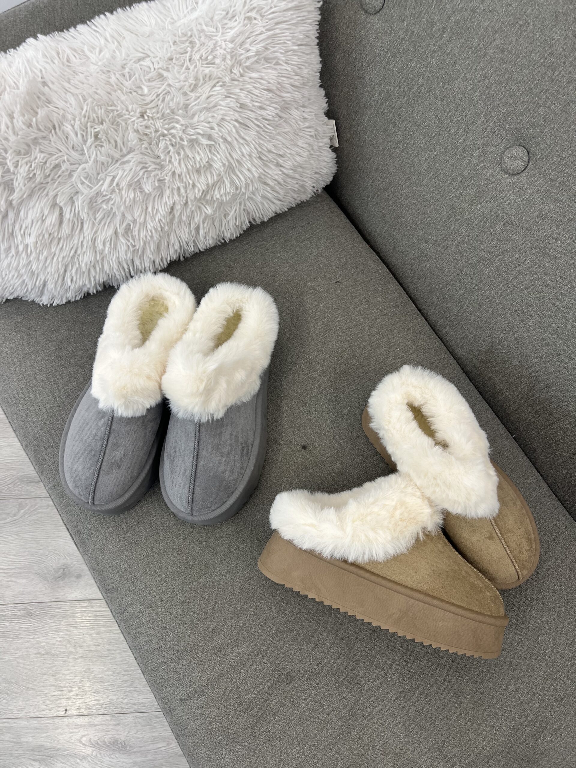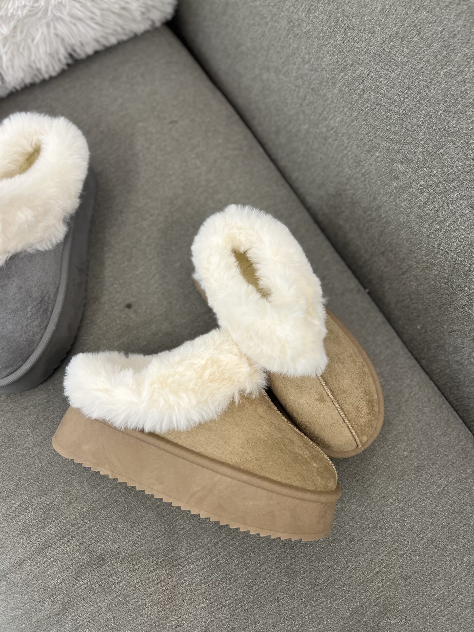 Pantofla shtëpie, ideale për muajt e ftohtë. Të dyja palët kanë një taban të trashë (platformë) dhe janë të veshura me material të butë (si suede ose mikrofibër) në pjesën e sipërme.