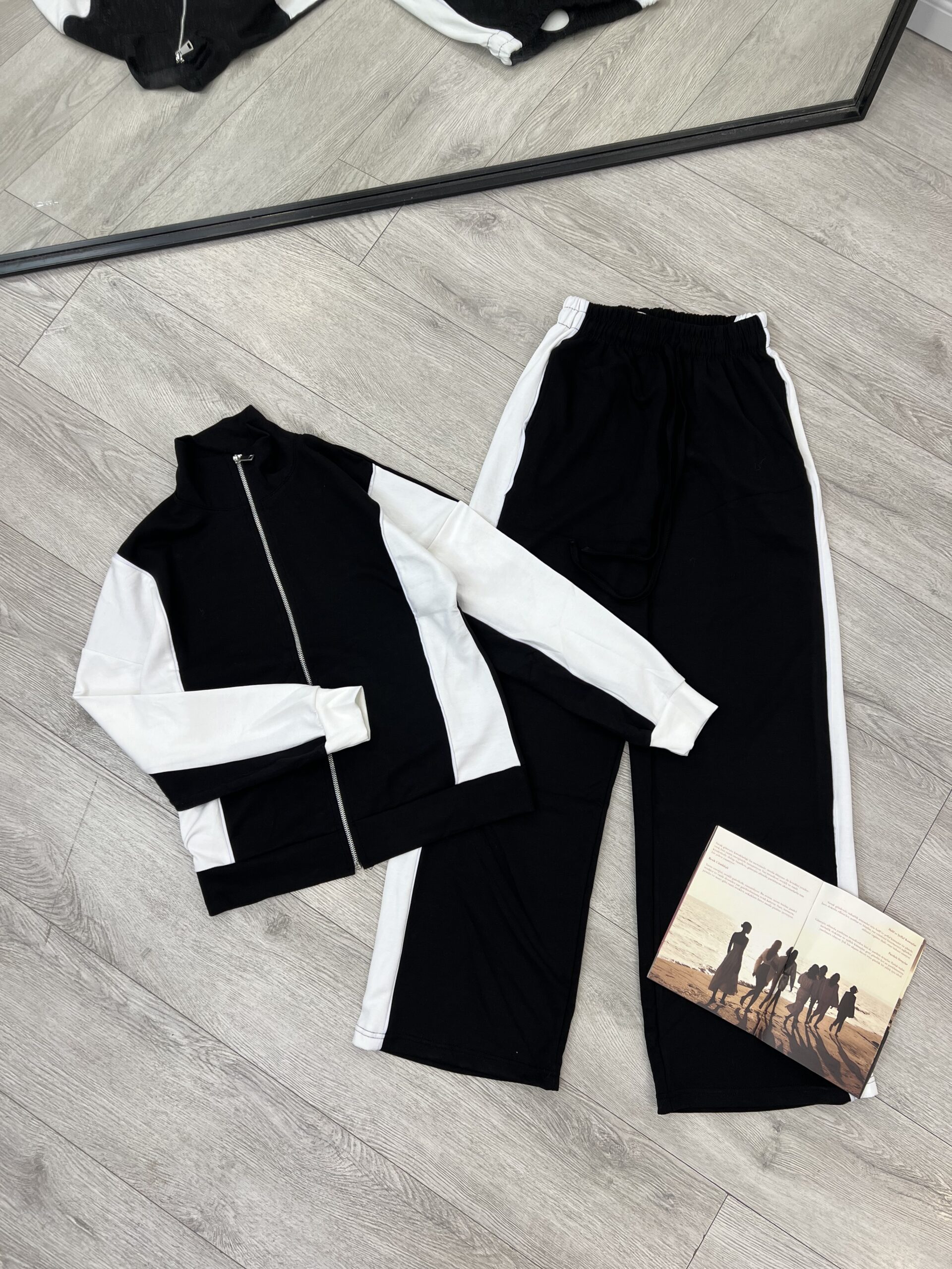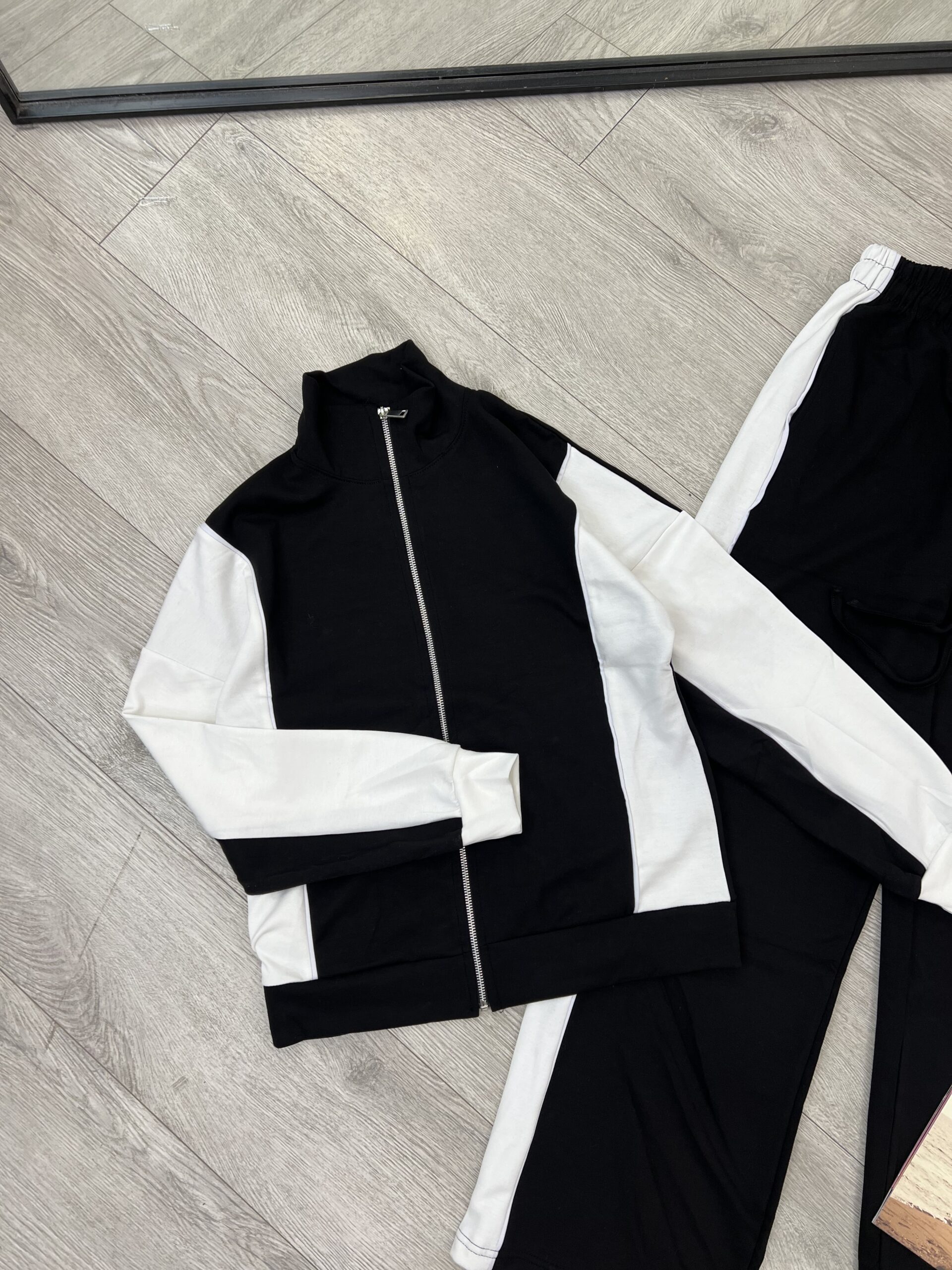 Xhaketa me zinxhir ka një dizajn unik, me trupin në ngjyrë të zezë dhe mëngët tërësisht të bardha. Pantallonat e gjera dhe të rehatshme janë të zeza dhe kanë një shirit të gjerë të bardhë në anë, duke krijuar një vijë vizuale të zgjatur. Ky kombinim ngjyrash krijon një pamje të fuqishme dhe moderne, perfekte për veshje të përditshme apo sportive.