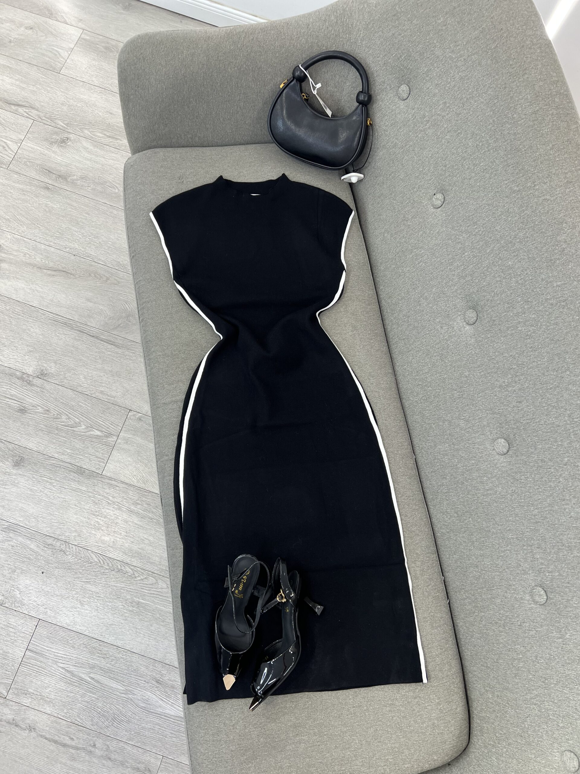 Në foto shihet një komplet veshjeje elegante i vendosur mbi një divan gri. Qendra e vëmendjes është një fustan i gjatë, i thurur me material kafe dhe me një model të thjeshtë e minimalist. Ky fustan është i ngushtë në bel dhe bie lirshëm poshtë. Përgjatë anës së fustanit dhe rreth qafës, një vijë e hollë e bardhë i jep atij një kontur modern dhe të theksuar. Së bashku me fustanin, janë vendosur dy aksesorë. Njëra është një çantë dore e vogël, me ngjyrë të zezë dhe formë gjysmëhëne, e cila i jep një prekje klasike dhe moderne pamjes. Tjetri aksesor janë një palë sandale me taka të larta, të shkëlqyeshme, me ngjyrë të zezë, të cilat kompletojnë veshjen dhe i japin një ndjenjë elegance. Ky komplet veshjeje, i përbërë nga fustani, çanta dhe sandalet, është ideal për një mbrëmje festive ose një event të veçantë.